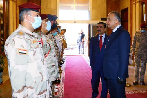 وعقد الكاظمي فور وصوله مقر الوزارة اجتماعا بحضور وزير الدفاع الفريق الركن جمعة عناد الجبوري وقادة التشكيلات والضباط والآمرين ، جدد خلاله "التأكيد على إلتزام المؤسسة العسكرية بمهامها الوطنية والمهنية، وفرض هيبتها وإحترامها والدفاع عن سيادة العراق وأمنه وإستقراره، وأن تكون لجميع العراقيين وتحرص على أداء واجبها في حماية الشعب العراقي ونظامه الديمقراطي والإبتعاد عن التسييس والمصالح الفئوية"، بحسب بيان صادر عن المكتب الاعلامي للكاظمي .