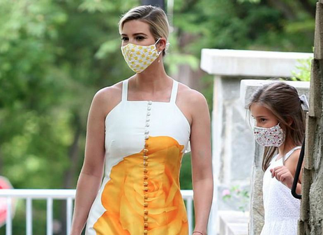 تألقت، إيفانكا ترامب، بإطلالة صيفية ناعمة؛ اعتمدت فيها فستاناً مميزاً بقيمة 1790 دولاراً باللونين الأصفر والأبيض نسقته مع كمامة طبية بسيطة من اللون ذاته.