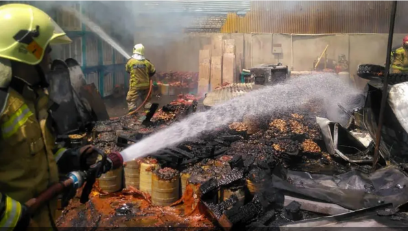 وطال الحريق مستودعاً وأرصفة بمساحة 3000 متر مربع، حيث أظهرت مقاطع فيديو النيران مشتعلة في كافة أقسام المصنع، بحسب ما نشرت العربية.