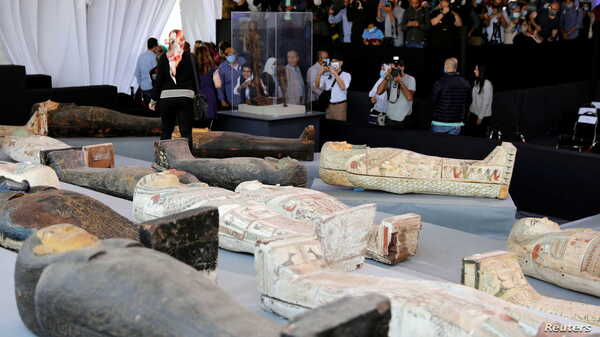 اكتشفت البعثة الأثرية المصرية بمنطقة سقارة في الجيزة، اليوم السبت (14 تشرين الثاني 2020)، ما يزيد عن 100 تابوت مغلق من العصر المتأخر (الأسرة الـ26) إلى جانب 40 تمثالا لمعبودات وأقنعة ملونة ومذهبة من ثلاث آبار.