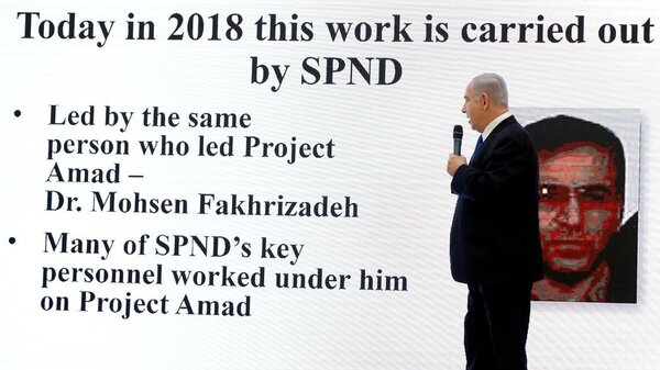 وأظهر على العلن في حينه في إحدى الوثائق التي عرضها وقال إن "الاستخبارات الإسرائيلية تمكنت من الحصول عليها من إيران"، الوثيقة حملت صورة للشخص المسؤول عن هذا المشروع السري المزدوج، كاشفا أنه محسن فخري زاده، قائلاً في حينه "احفظوا جيدا هذا الاسم".