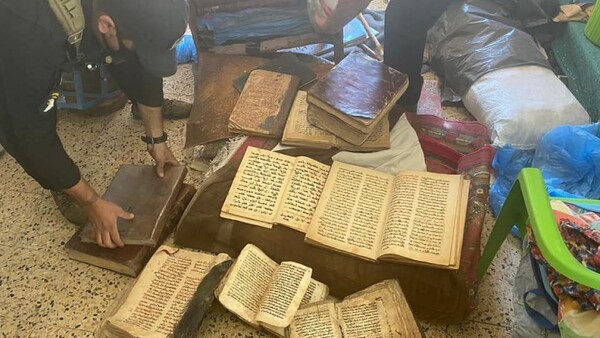 نوه البيان أن "الكتب كانت موضوعة داخل صندوق حديدي مخبأة في قطع من البناء داخل مطبخ دار الإرهابي والتي سرقت من الكنائس خلال فترة سيطرة داعش على مدينة الموصل".