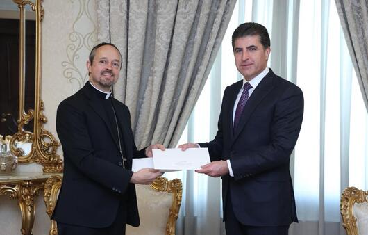 وفي اللقاء سلم سعادة سفير الفاتيكان رسالة لقداسة البابا إلی فخامة الرئيس نيجيرفان بارزاني، هذا نصها: