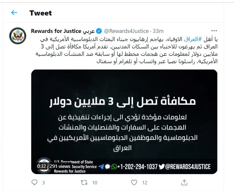 أعلن برنامج "المكافات من أجل العدالة" التابع للخارجية الأميركية، اليوم الخميس (10 حزيران2021)، تقديم مكافاة ثلاثة ملايين دولار، مقابل معلومات عن أي هجمات مخطط لها مستقبلا أو حتى نفذت في السابق، ضد منشاءات دبلوماسية أميركية في العراق.