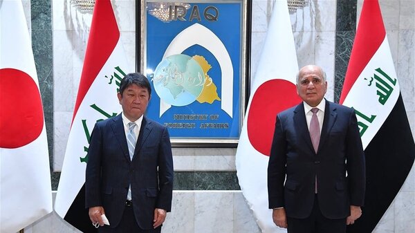 جاء ذلك خلال استقبال وزير الخارجية فؤاد حسين نظيره الياباني في بغداد، حيث بحثا معاً العلاقات الثنائيَّة بين البلدين، وسُبُل الارتقاء بها إلى ما يُلبِّي بالإضافة إلى القضايا الإقليميّة، والدوليّة ذات الاهتمام المُشترَك، وفق بيان الخارجية.