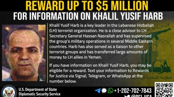 رصدت وزارة الخارجية الأميركية، اليوم الأحد (22 آب 2021)، مكافأة مالية قدرها 5 ملايين دولار لمن يدلي بمعلومات عن "زعيم" في حزب الله اللبناني، يدعى خليل حرب، قالت إنه "حلقة وصل" مع جماعات "إرهابية".