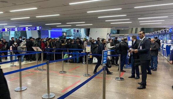 ونشرت الخطوط الجوية العراقية صوراً لحظة وصول المواطنين العراقيين العالقين في بيلاروسيا داخل مطار مينسك لقطع تذاكر السفر على متن الناقل الوطني.