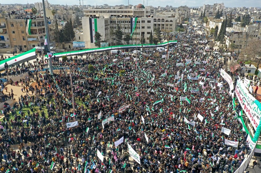 أحيا آلاف السوريين، اليوم الثلاثاء، في مدينة إدلب ذكرى مرور 11 عاماً على انطلاق احتجاجات طالبت بإسقاط الحكومة قبل أن تتحول إلى نزاع دام في تظاهرة رُفعت فيها شعارات مؤيدة لأوكرانيا ضد الغزو الروسي.