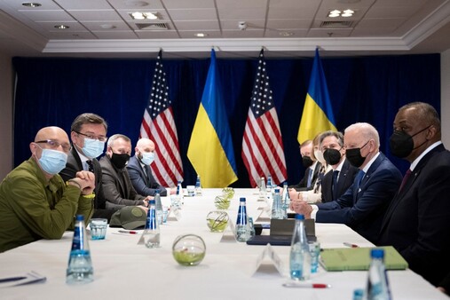 وجلس بايدن في هذا اللقاء الأول مع مسؤولين أوكرانيين كبار منذ بدء الغزو الروسي، إلى طاولة بجانب وزيري الخارجية والدفاع الأميركيين أنتوني بلينكن ولويد أوستن، مقابل وزيري الخارجية والدفاع الأوكرانيين دميترو كوليبا وأوليسكي ريزنيكوف.