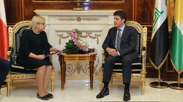 استقبل رئيس وزراء اقليم كوردستان، نيجرفان بارزاني، وزيرة الشؤون الإنسانية البولندية بياتا ديمبا ، ووفداً مرافقاً لها، يوم الاربعاء .