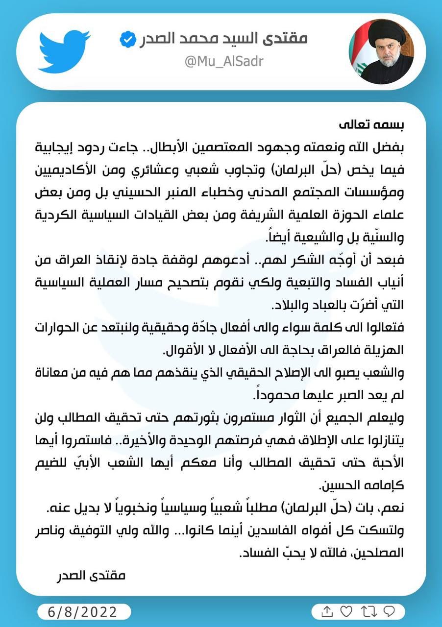 أكد زعيم التيار الصدري، مقتدى الصدر، اليوم السبت (6 آب 2022)، أن حل البرلمان بات مطلباً شعبياً وسياسياً ونخبوياً لا بديل عنه، مشيراً إلى أن "الثوار مستمرون بثورتهم حتى تحقيق المطالب ولن يتنازلوا على الإطلاق فهي فرصتهم الوحيدة والأخيرة".