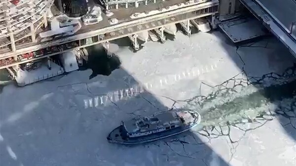 وتبدو سفينة في نهر شيكاغو، في ولاية إلينوي، وهي تشق مسارها وسط النهر المتجمد من جراء هبوط الحرارة إلى 21 درجة دون الصفر.