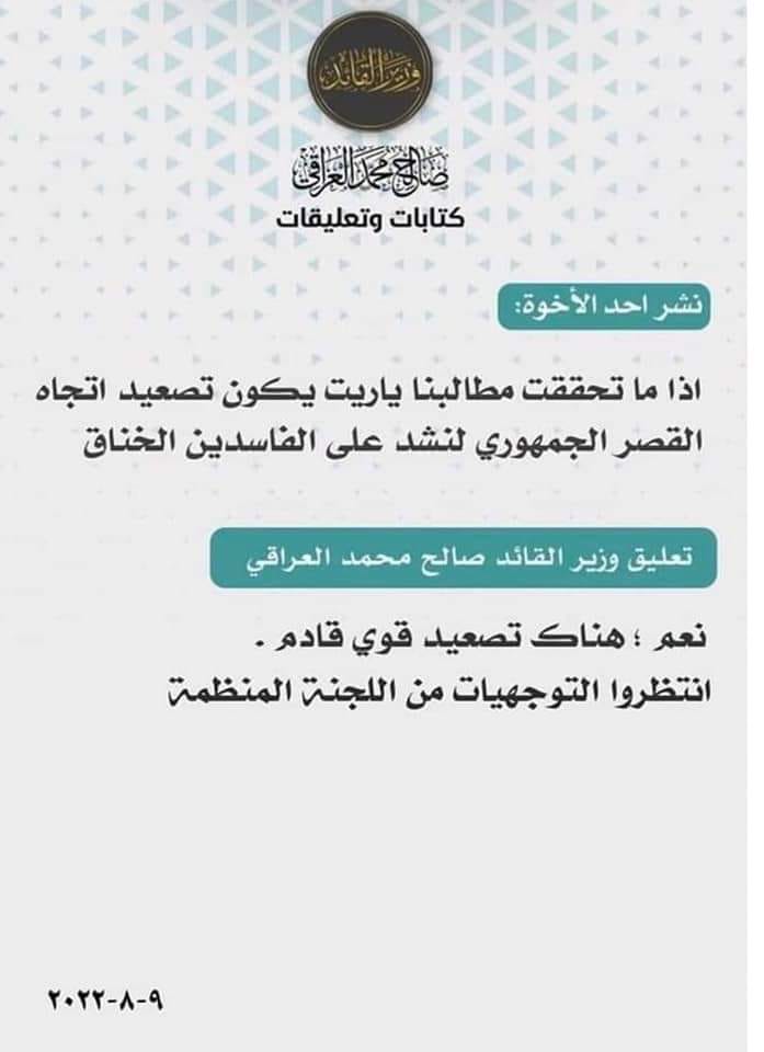ونشر صالح محمد العراقي منشوراً جاء فيه "نشر أحد الأخوة: اذا ما تحققت مطالبنا ياريت يكون تصعيد تجاه القصر الجمهوري لنشد على الفاسدين الخناق".