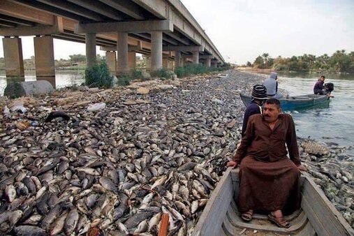 تداولت مواقع التواصل الاجتماعي العراقية، اليوم السبت (13 آب 2022)، مشاهد لنفوق كميات كبيرة من الأسماك في شط الزبير بمحافظة البصرة، حيث أدى ارتفاع نسبة ملوحة المياه والتلوث إلى نفوق هذه الكميات من الأسماك.