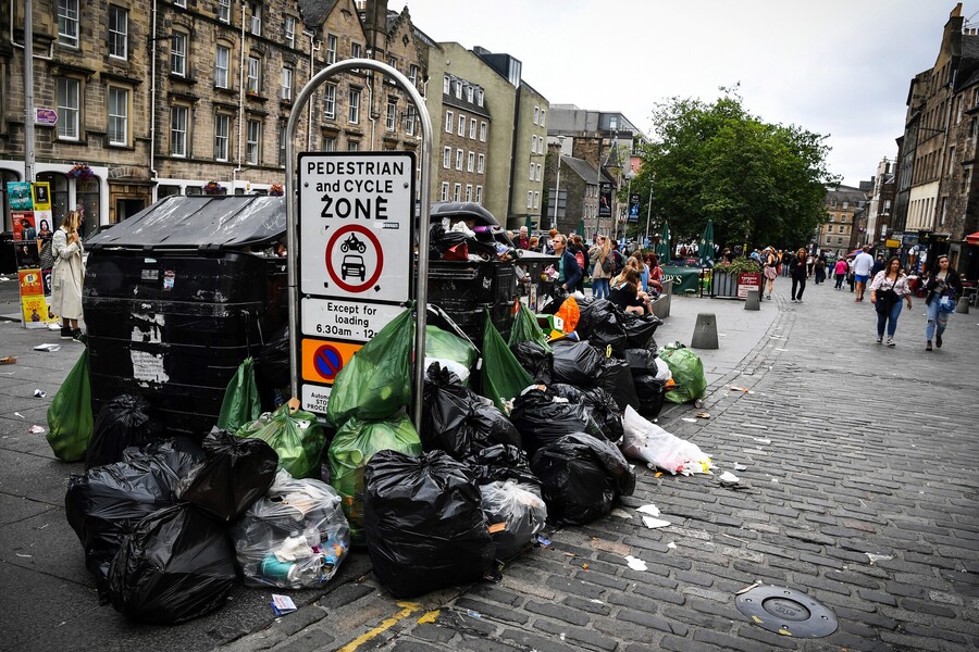 فاضت القمامة من مستوعباتها في شوارع أدنبره الثلاثاء وسط إضراب لعمّال بلدية المدينة تزامن مع الأسبوع الأخير لمهرجانها الفني الدولي الشهير.