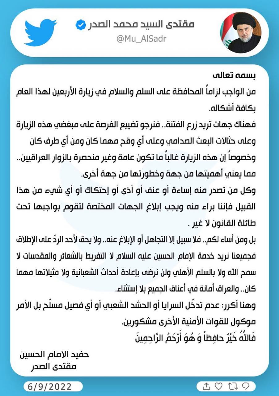 وقال الصدر في تغريدة: "من الواجب لزاماً المحافظة على السلم والسلام في زيارة الأربعين لهذا العام بكافة أشكاله".