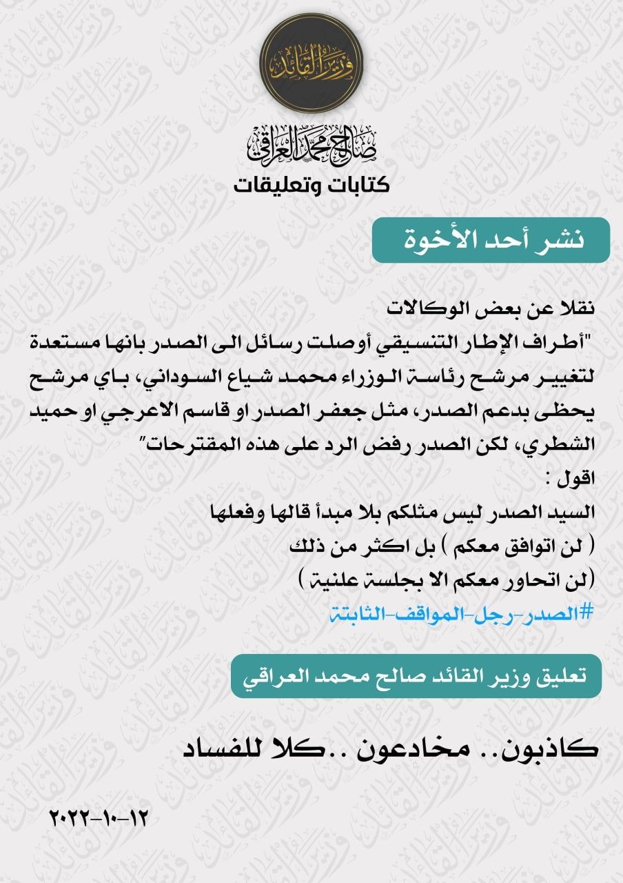 وقال العراقي، في بيان، رداً على ما تردد عن تلقي الصدر، رسائل من الإطار التنسيقي بشأن استعدادها لتغيير مرشح رئاسة الوزراء محمد شياع السوداني، بأي مرشح يحظى بدعم الصدر، مثل جعفر الصدر أو قاسم الأعرجى، أو حميد الشطري، لكن الصدر رفض الرد على هذه المقترحات"، بأنهم "كاذبون..مخادعون..كلا للفساد".