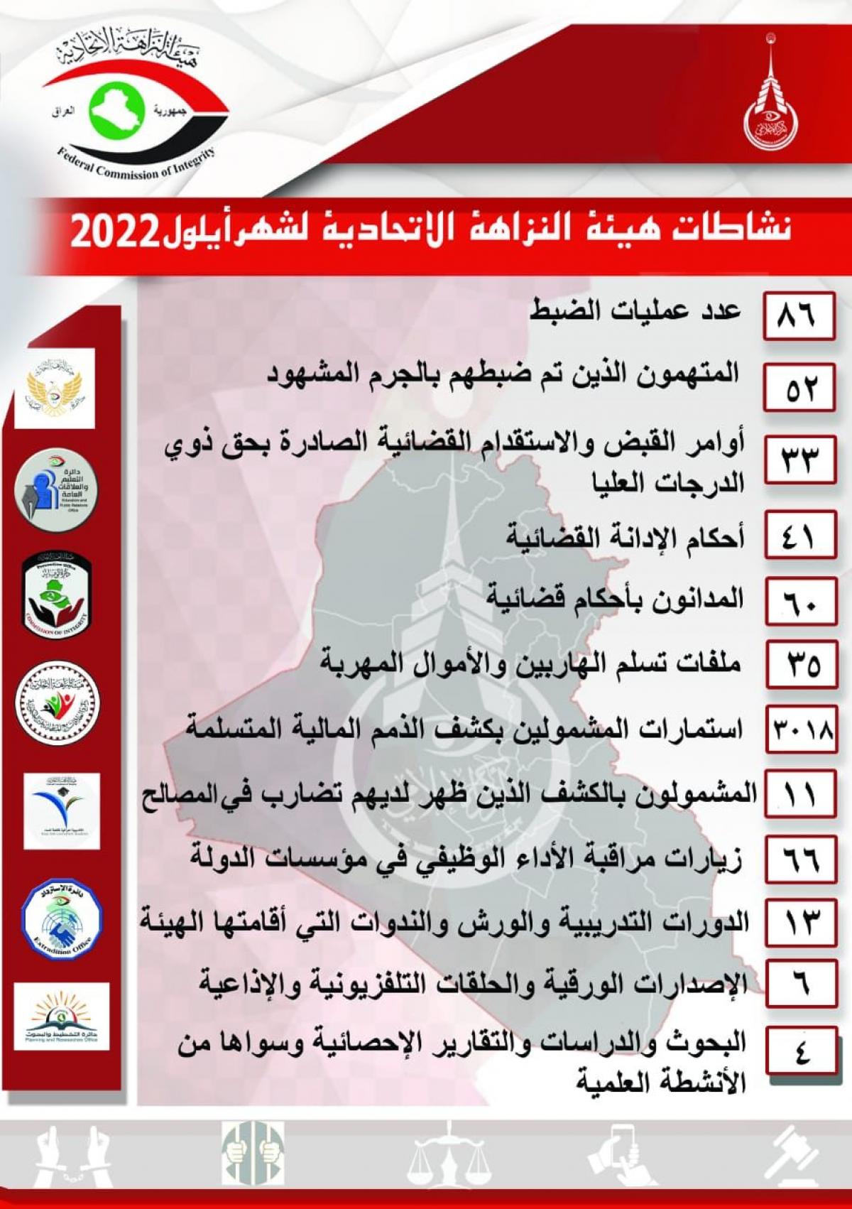 أعلنت هيئة النزاهة الاتحادية، اليوم الثلاثاء (18 تشرين الأول 2022)، أبرز إنجازاتها خلال شهر أيلول الماضي، فيما أكدت تنفيذ 86 عملية ضبط.