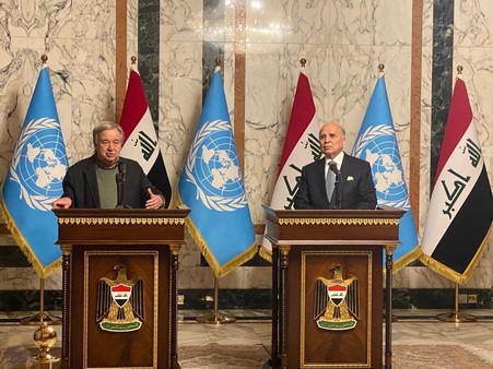 أكد وزير الخارجية العراقي فؤاد حسين، اليوم الأربعاء (1 آذار 2023)، أن علاقات العراق مع الأمم المتحدة تفاعلية وقوية، فيما وجّه بالشكر للأمين العام للأمم المتحدة أنطونيو غوتيرش، على زيارته للعراق، فيما أعرب غوتيرش، عن ثقته بأن العراقيين سيتغلبون على التحديات، وأنه سيقابل النازحين العراقيين في إقليم كوردستان العراق.
