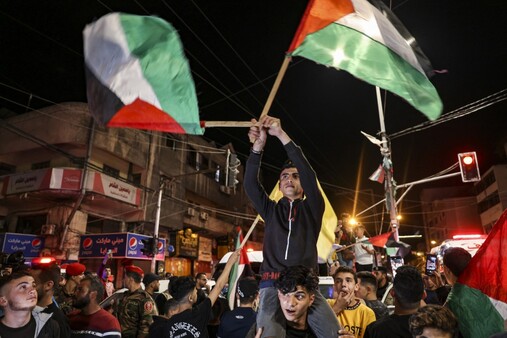 واحتفالاً "بالنصر" تجمع مئات الفلسطينيين في ساحة في غزة رافعين الأعلام الفلسطينية أو رايات فصائل فلسطينية.