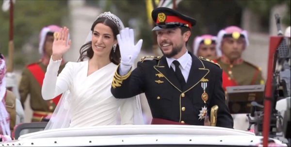 وتزينت شوارع المملكة بصور العروسين ولافتات كتب عليها "نفرح بالحسين" بينما اصطف آلاف الأردنيين على جانبي مسار موكب العرس الملكي لمشاهدة العروسين والاحتفال بهما.