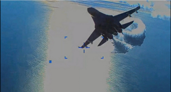 ونشرت القوات الجوية الأميركية مقطع فيديو أظهر تحليق المقاتلة الروسية قرب المسيرة الأميركية وإلقاء القنابل المضيئة أمامها.