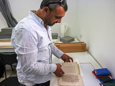 عقب التنظيف، ينتقل المرمّم الوحيد في المكتبة، الى تفحّص مخطوط قواعد لغة عربية أخرجه من الخزانة ويعود إلى ما قبل 200 عام تقريبا.