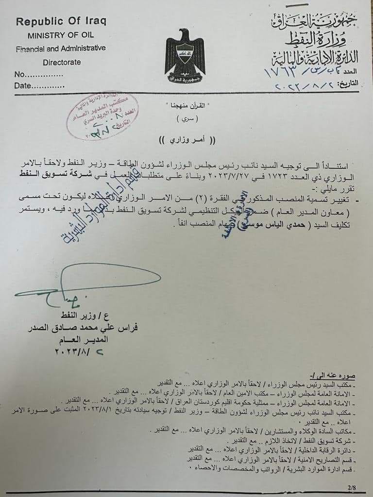 وأضاف: "بعد موافقة السيد رئيس الوزراء العراقي، محمد شياع السوداني، أصدرت وزارة النفط العراقية أمراً وزارياً بهذا الغرض، وباشر د. حمدي شنكالي مهام عمله في شركة سومو".