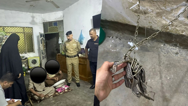 وأثناء التحري تبين وجود امرأة ورجل كبيرين بالسن مع ابنائهما مقيدين بالسلاسل ومعنفين.
