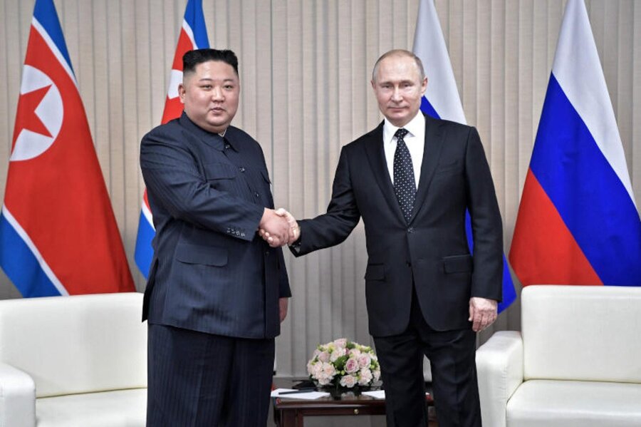 وفي مستهل الاجتماع الذي عقده بوتين وكيم في مطار فوستوشني الفضائي بمقاطعة آمور في أقصى الشرق الروسي، أحدث موقع لإطلاق الصواريخ الفضائية في روسيا، وقال بوتين وهو يصافح كيم مطوّلاً "أنا سعيد برؤيتك... هذه هي قاعدتنا الفضائية الجديدة"، مشيراً إلى أن اللقاء يجري "في وقت خاص"، حيث احتفلت كوريا الشمالية مؤخرا بالذكرى الـ75 لتأسيس الدولة، مشيرا إلى أن الاتحاد السوفيتي كان أول من اعترف بها.