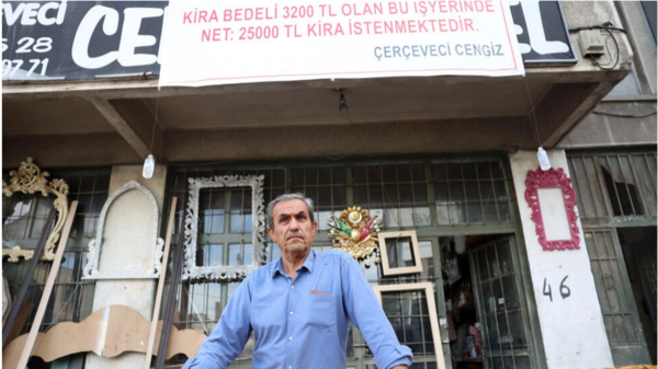 علق التركي جنكيز أورسيل، لافتة خارج ورشة النحت الخشبية الخاصة به للتنديد بطلب صاحب العقار رفع الإيجار إلى مستوى غير مسبوق، بينما يجد الحرفي نفسه مهددا بالإخلاء بعد عشرين عاما.