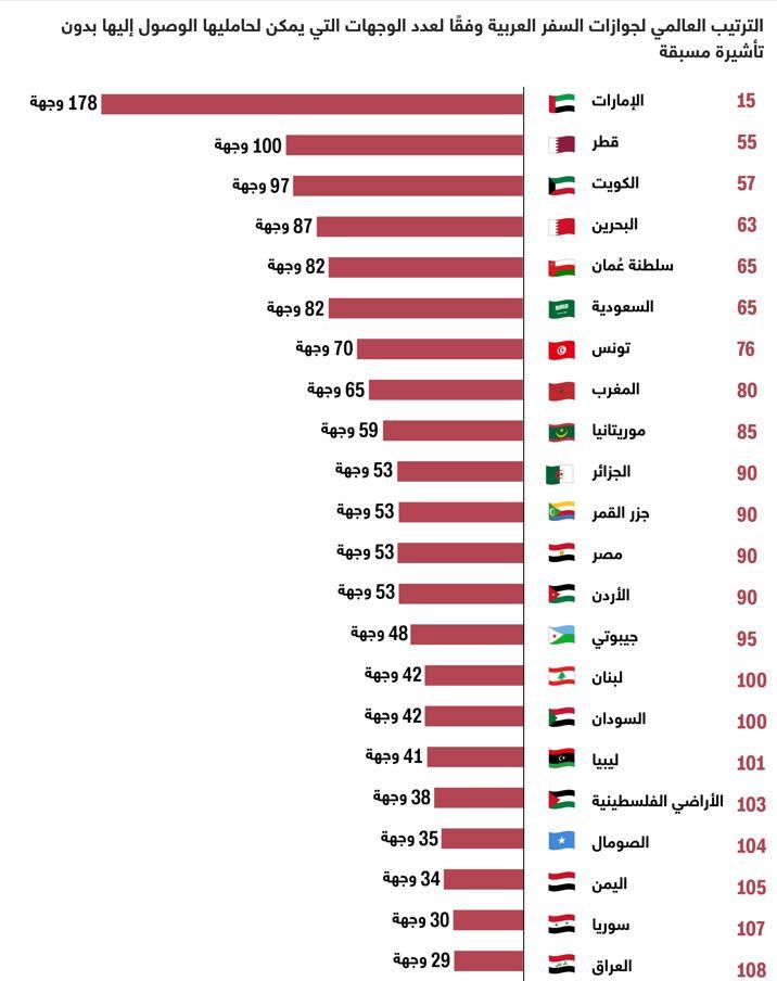 وحاز العراق على المرتبة الأخيرة كأضعف جواز سفر عربي، حسب عدد وجهات السفر المسموح الوصول إليها من دون تأشيرة مسبقة (29 وجهة فقط)، فيما حل في المركز الـ 108، أي ما قبل الأخير، عالمياً.