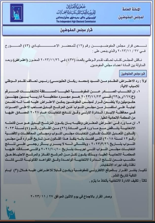 ووفقا للقرار الصادر عن الأمانة العامة لمجلس المفوضين، بتاريخ 27 من شهر تشرين الجاري، فإن "طلبه (أي الحلبوسي) بأن يكون المرشح البديل هو من قائمته الانتخابية، يتناقض مع ما ورد في المادة (23) من قانون رقم (4) لسنة 2023، (قانون التعديل الثالث لقانون انتخابات مجلس النواب، ومجالس المحافظات والاقضية رقم (12) لسنة 2018)، التي قضت بأن ينفذ هذا القانون من تاريخ إقراره في مجلس النواب بتاريخ 26 - 3 – 2023".