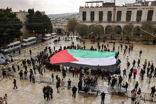 صباحا، رفع علم فلسطيني ضخم في ساحة المهد حمله فلسطينيون من مختلف الأعمار والديانات.