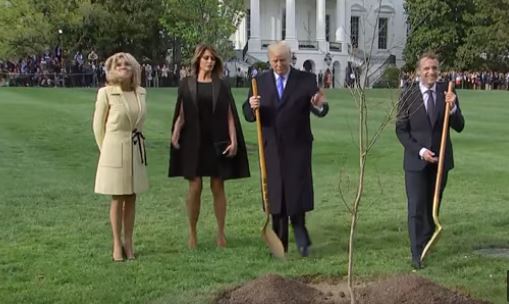وبعد مراسم الاستقبال الرسمية التي بدأت بإطلاق 21 طلقة للضيف الفرنسي، قام الرئيسان الفرنسي والأمريكي بزرع غرسة سنديان، أحضرها معه ماكرون، في حديقة البيت الأبيض، كرمز للصداقة بين البلدين ثم بدءا بجولة في المكتب البيضاوي.