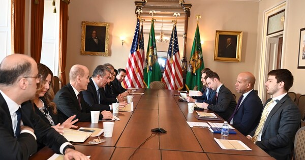 ضمن برنامج زيارته الرسمية إلى واشنطن، اجتمع رئيس حكومة إقليم كوردستان، مسرور بارزاني، اليوم الجمعة (1 آذار 2024)، مع وكيل وزارة الخزانة الأمريكية لشؤون الإرهاب والاستخبارات المالية، بريان نيلسون.