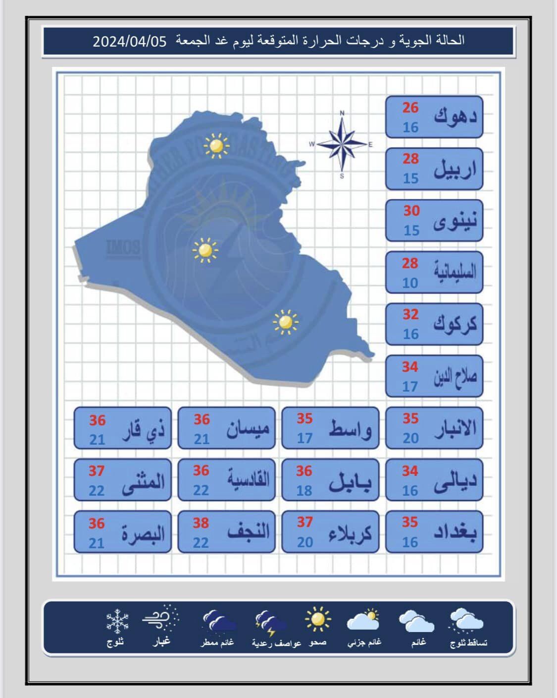 ويكون طقس السبت أيضاً صحواً مع بعض الغيوم في المنطقتين الوسطى والجنوبية، ويكون غائماً مع تساقط أمطار خفيفة في المنطقة الشمالية وإقليم كوردستان، وترتفع درجات الحرارة قليلاً عن اليوم السابق في عموم البلاد، بحسب البيان.
