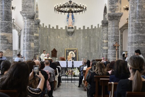 في كنيسة الكلدان الكاثوليك، التي يعود تاريخ بنائها إلى العام 1944، أنشد الحاضرون التراتيل أمام المذبح وتحت أعمدة الكنيسة الرخامية والرمادية. وقد حملت قبتا الكنيسة، ولونهما أحمر يخطف الأنظار، صليبين كبيرين.