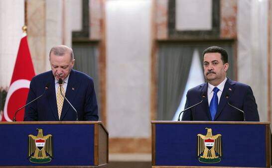 السوداني قال في مؤتمر صحفي مشترك مع الرئيس التركي رجب طيب أردوغان اليوم الاثنين، إن "زيارة الرئيس أردوغان تعبير واضح عن عمق العلاقة بين البلدين، والملفات المتعددة التي تصبّ في صالح الجارين، لدينا مشتركات دينية وثقافية واجتماعية وحضارية مع الجارة تركيا، جوارنا التاريخي له أبعاد تربط الشعبين العراقي والتركي بصورة متميزة".