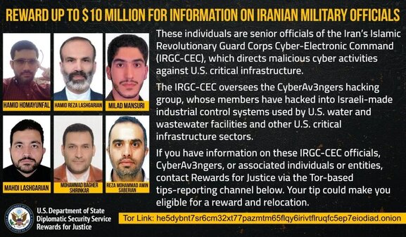 حددت الولايات المتحدة مكافأة تصل إلى عشرة ملايين دولار، مقابل معلومات تؤدي إلى تحديد أو اكتشاف موقع من تعتقد أنهم المنفذين الستة الرئيسيين لهجمات إلكترونية ضد مواقع لمؤسسات إسرائيلية وأميركية.