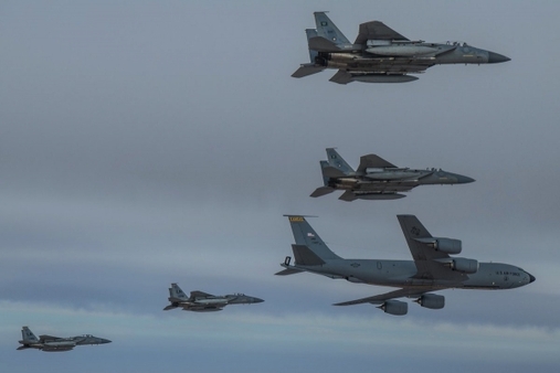 نشرت وكالة الأنباء السعودية صورا لتحليق طائرات القوات السعودية والاميركية، في تشكيل مشترك فوق منطقة الخليج العربي.