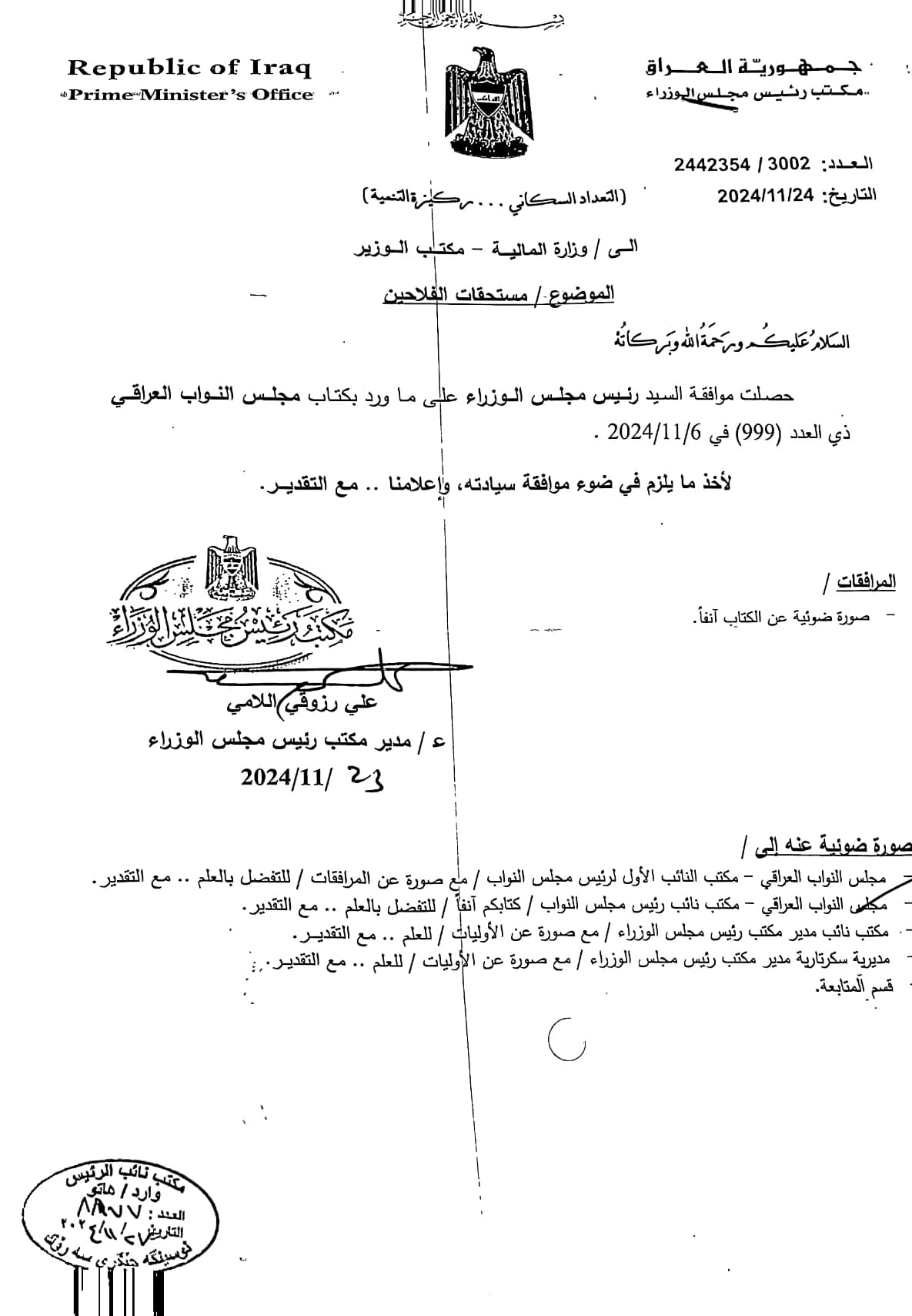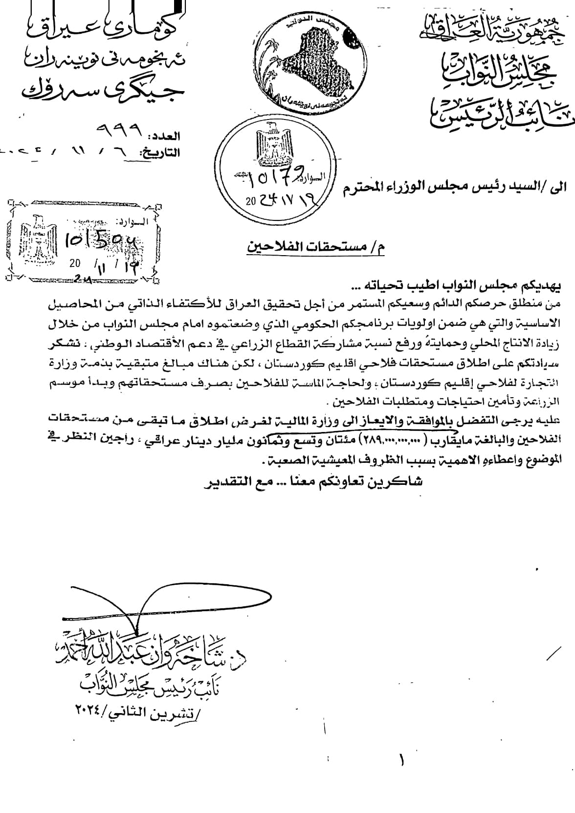 وذكر المكتب عبر بيان: أنه "استجاب رئيس مجلس الوزراء الاتحادي، محمد شياع السوداني، لطلب نائب رئيس مجلس النواب العراقي شاخوان عبدالله أحمد، الذي تضمن وبالوثيقة طلب صرف المستحقات من المبالغ المتبقية بذمة وزارة التجارة في الحكومة الاتحادية لفلاحي إقليم كوردستان بهدف تحقيق الإكتفاء الذاتي من المحاصيل ومن أجل إستمرار الدعم لقطاع الزراعة والاقتصاد الوطني وزيادة حجم الإنتاج المحلي لتأمين حاجة المواطنين في البلاد".