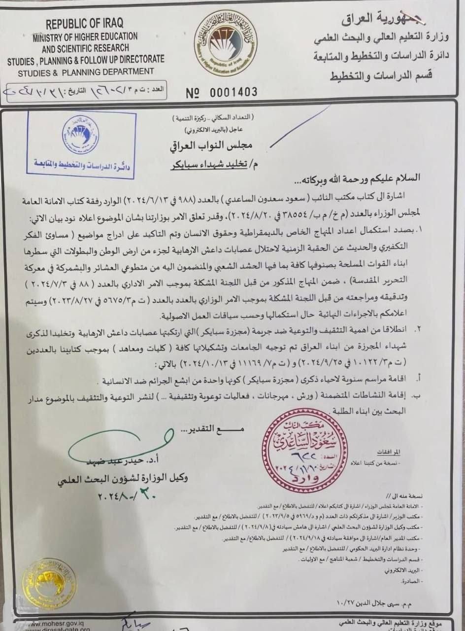 وأضافت أنه "انطلاقاً من أهمية التثقيف والتوعية ضد جريمة (مجزرة سبايكر)، التي ارتكبتها عصابات داعش الإرهابية وتخليداً لذكرى شهداء المجزرة من أبناء العراق، تم توجيه الجامعات وتشكيلاتها كافة (كليات ومعاهد)، باقامة مراسم سنوية لإحياء ذكرى مجزرة سبايكر".