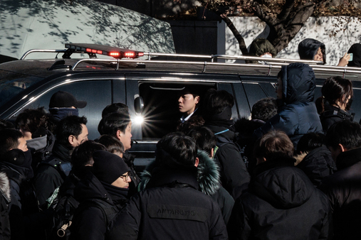 وشاهد صحافيون في وكالة فرانس برس يون يتمّ اقتياده من مقرّ إقامته الرسمي المحصّن بشدّة في وسط سيول ضمن موكب أمني إلى مقرّ هيئة التحقيق بفساد كبار المسؤولين بعد أن أعلن فريق مشترك من المحقّقين والشرطة أنّهم نفّذوا مذكرة الاعتقال الصادرة بحقه.