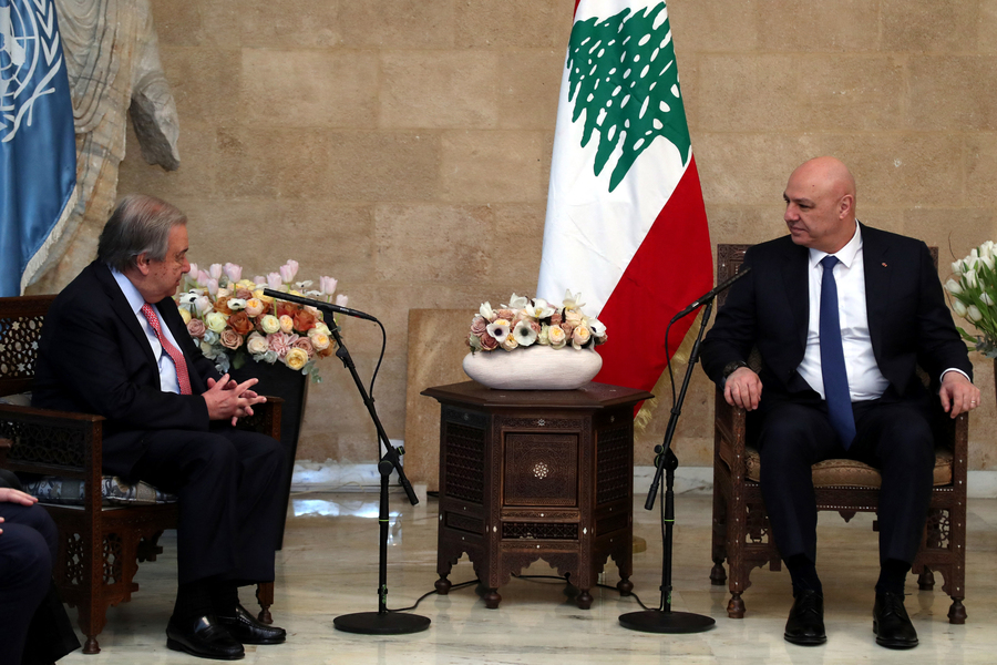 وقال عون خلال استقباله الأمين العام للأمم المتحدة أنطونيو غوتيريش إن "لبنان متمسك بضرورة انسحاب القوات الإسرائيلية من أراضيه المحتلة في الجنوب ضمن المهلة التي حددها الاتفاق الذي تم التوصل إليه في 27 تشرين الثاني الماضي"، وفق بيان صادر عن الرئاسة اللبنانية.