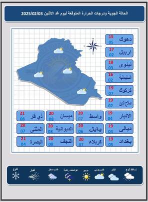 وتتراوح درجة الحرارة العظمى و الصغرى بين 3- 15 في محافظات إقليم كوردستان، إلى 8- 22 في محافظات وسط وجنوب العراق.