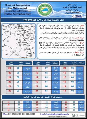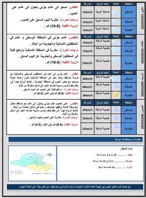 توقعت هيئة الأنواء الجوية، اليوم الأحد (2 شباط 2025)، توقعت تساقطاً للأمطار وتصاعداً للغبار مع حدوث عواصف رعدية خلال نهاية الأسبوع الجاري.