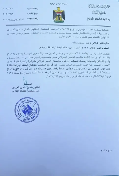 أصدرت محكمة القضاء الإداري، اليوم الأحد (9 شباط 2025)، أمراً ولائياً بإيقاف إجراءات إقالة عمار القيسي وإعادته رئيساً لمجلس محافظة بغداد.