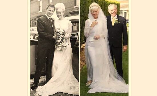 زوجان بريطانيان احتفلا بعيد زواجهم الخمسين بنفس ملابس زفافهم الأصلية وعندما سئلا عن سبب سعادتهم واستمرار زواجهم قالو:الضحك..