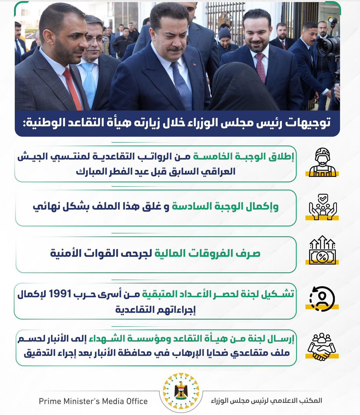 -إطلاق الوجبة الخامسة من الرواتب التقاعدية لمنتسبي الجيش العراقي السابق، قبل عيد الفطر المبارك، وإكمال الوجبة السادسة بعدها مباشرة، ليتم غلق هذا الملف بشكل نهائي.